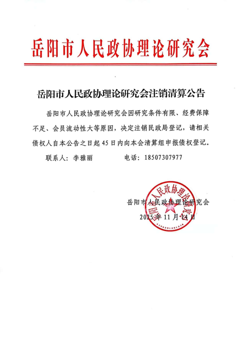 岳阳市人民政协理论研究会注销清算公告