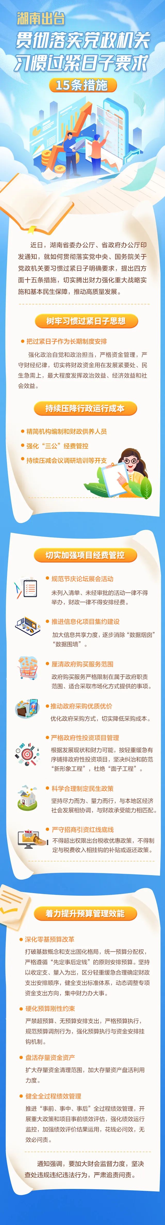 近几年,湖南严格落实过紧日子要求,压降省级一般性支出预算31%,盘活省级存量资金357亿元,统筹用于基层“三保”等重点领域,全省民生支出占比稳定在70%以上。在此前的基础上,这次发文深入贯彻落实党的二十届三中全会精神,进一步拓展过紧日子的内涵外延,硬化具体举措,明确负面清单,推动过紧日子成为习惯。