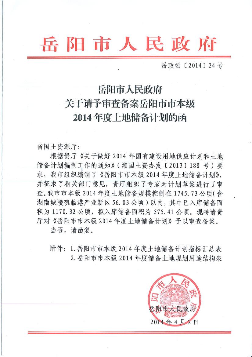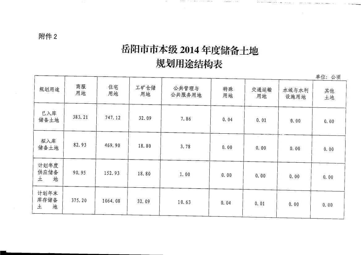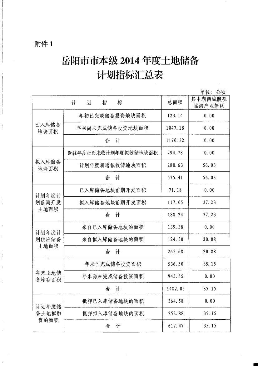 岳阳市市本级2014年度土地储备计划指标汇总表