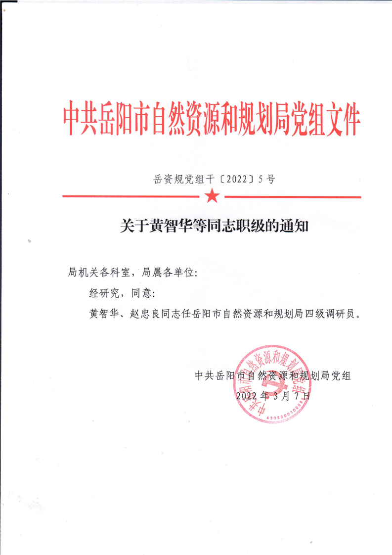 关于黄智华等同志职级的通知 岳资规党组干〔2022〕5号
