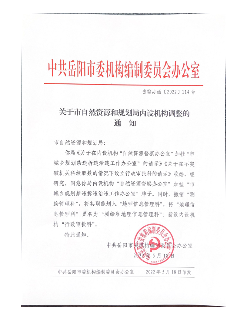 关于市自然资源和规划局内设机构调整的通知 岳编办函〔2022〕114号