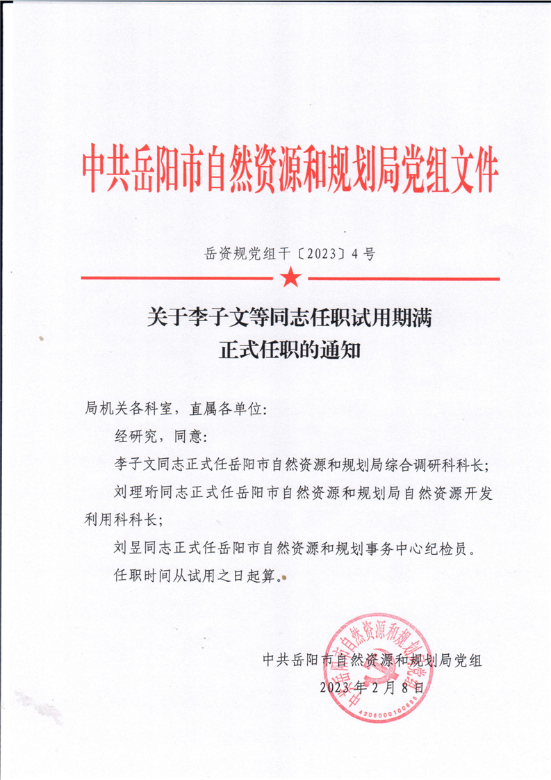 关于李子文等同志任职试用期满正式任职的通知