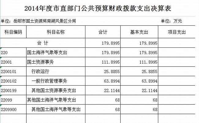 2014年度岳阳市国土资源局南湖风景区分局公共预算财政拨款支出决算表