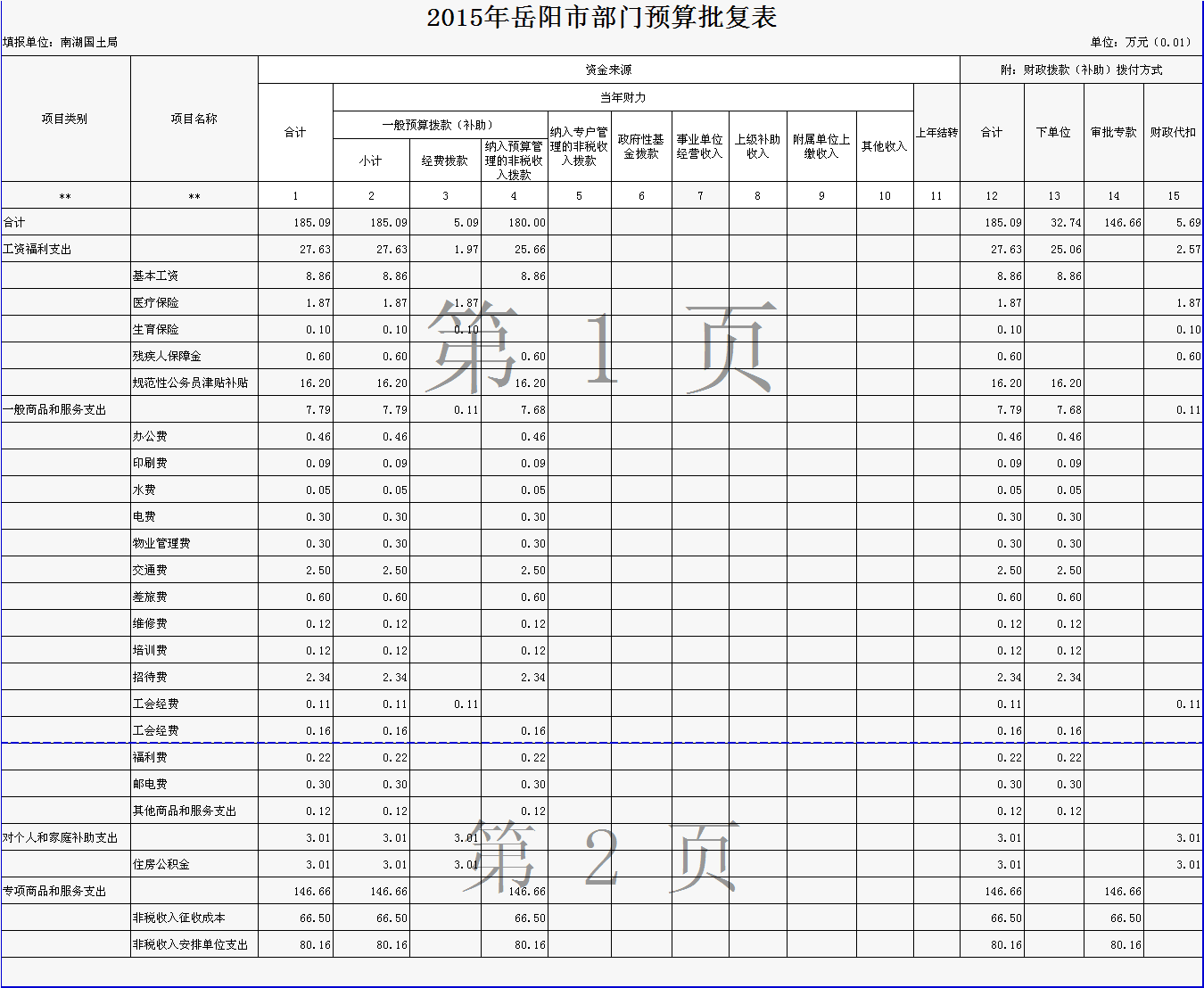 2015年度岳阳市国土资源局南湖风景区分局部门预算批复表