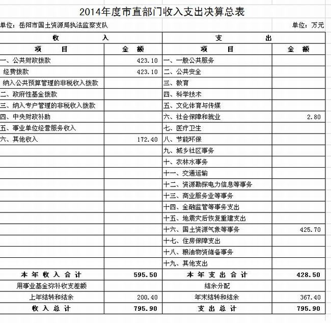 2014年度岳阳市国土资源局执法监察支队收入支出决算总表
