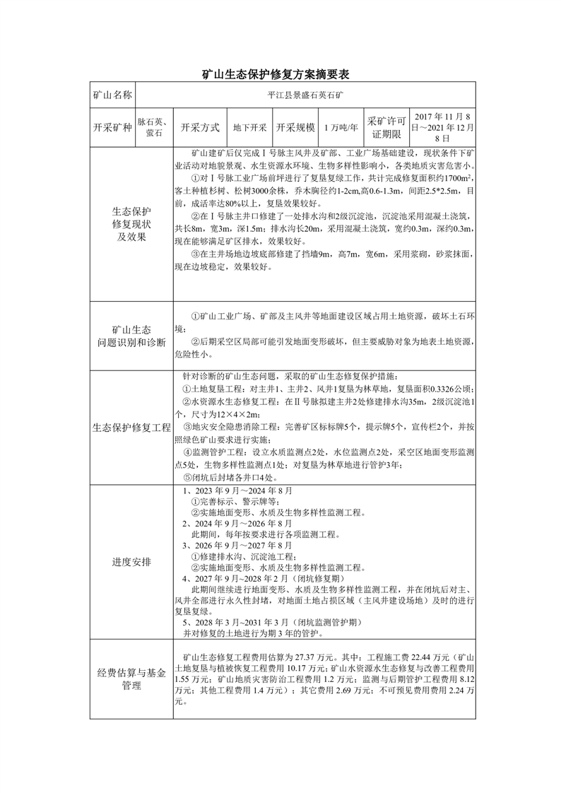 湖南省平江县景盛石英石矿矿山生态保护修复方案
