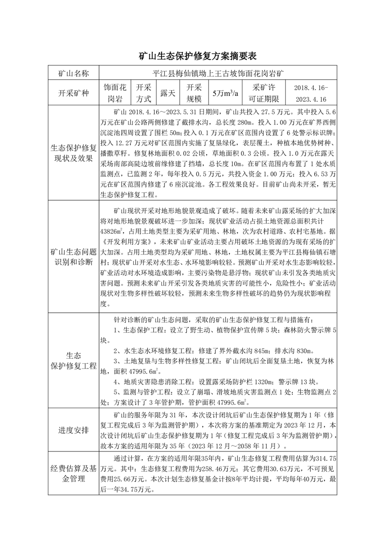 湖南省平江县梅仙镇坳上王古坡饰面用花岗岩矿矿山生态保护修复方案