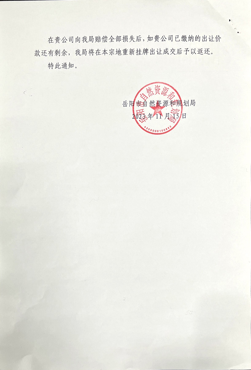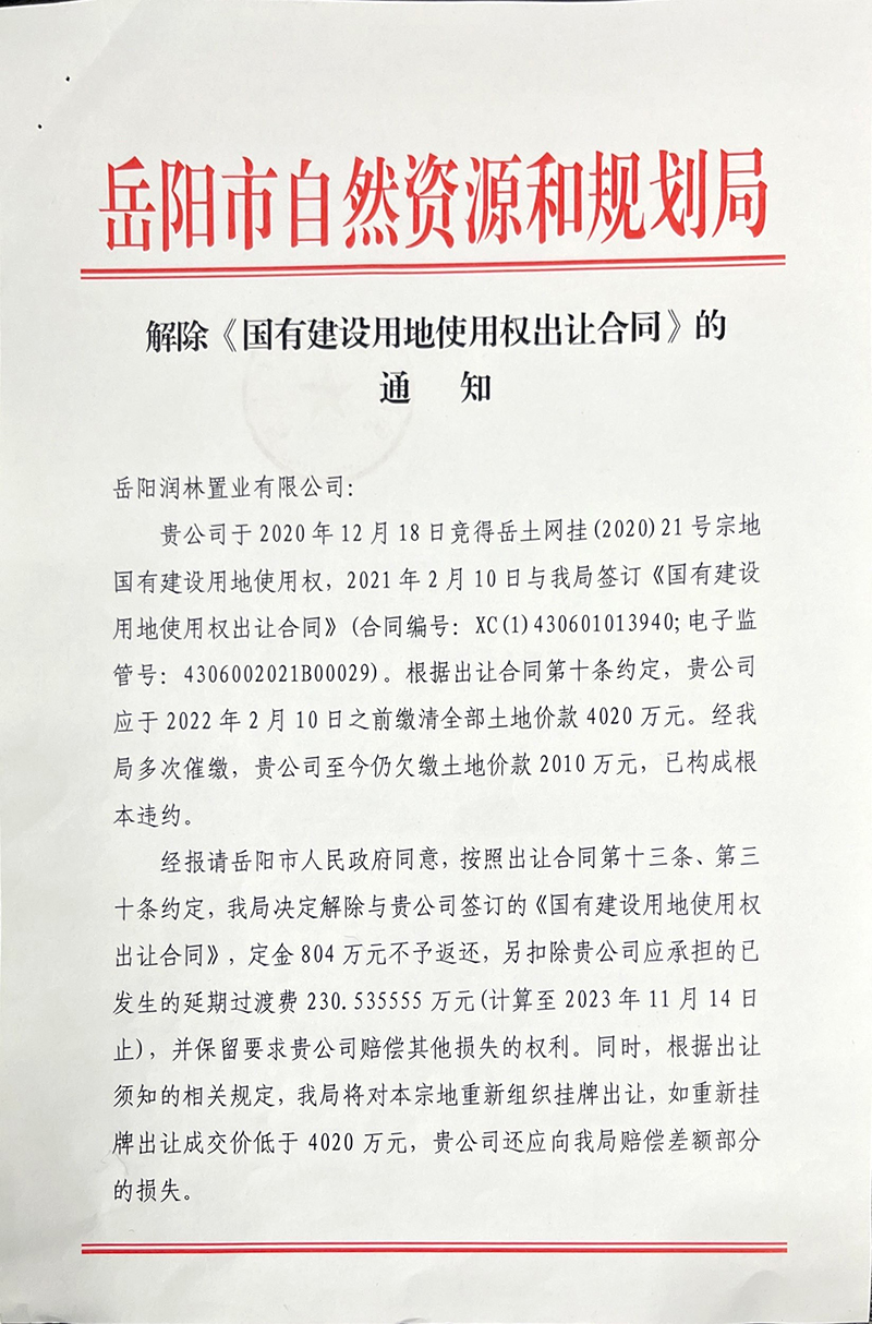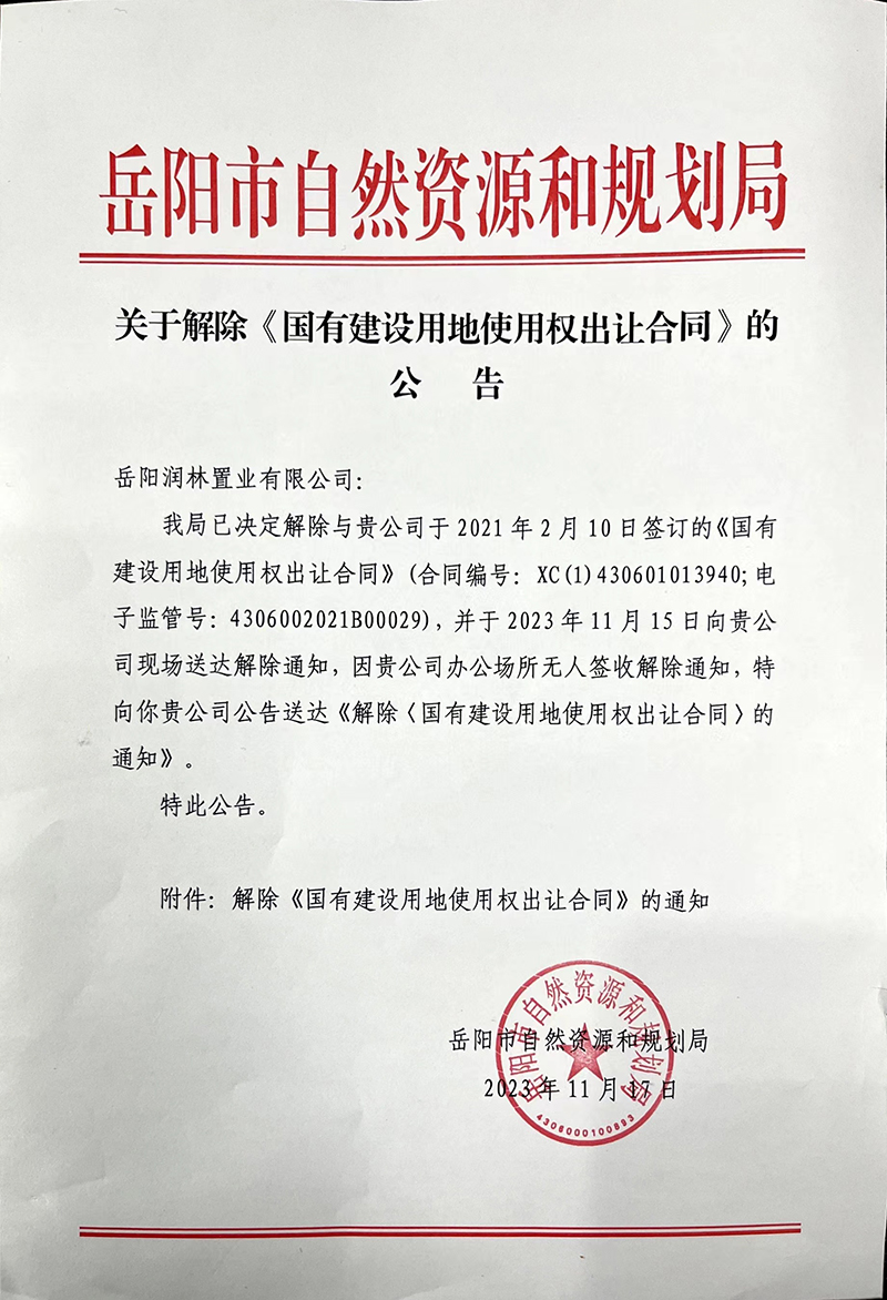 关于解除《国有建设用地使用权出让合同》的公告
