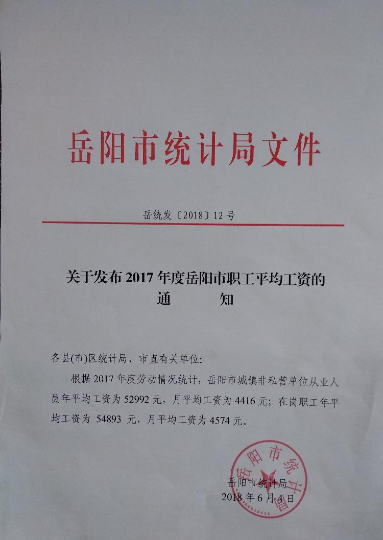 关于发布2017年度岳阳市职工平均工资的通知