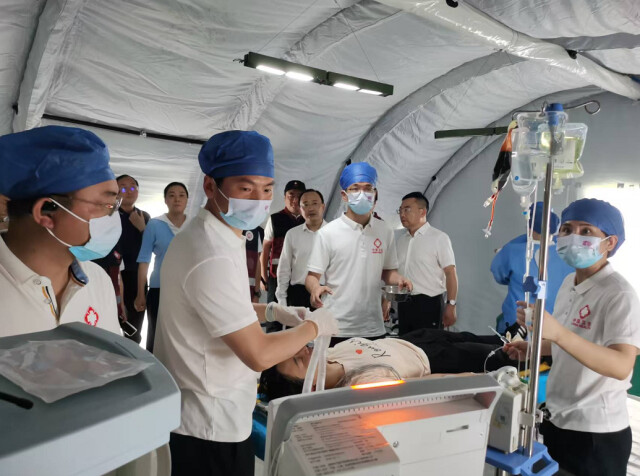 鉴于我省洪涝灾害频发,本次演练以假设某地遭遇持续性强降雨,发生山洪、泥石流灾害,导致26名群众受伤被困为背景,设置了人员转移、伤员救治、防疫消杀、心理干预等关键环节,按照启动应急响应、开展先期处置、批量伤员处置、组织撤收归拢4个阶段进行。湖南省人民医院国家紧急医学救援队及岳阳市13支市县级紧急医学救援队共268名队员、30余辆各类卫生应急保障车、1架救援直升机、3艘水上冲锋艇、3架无人机参与演练。