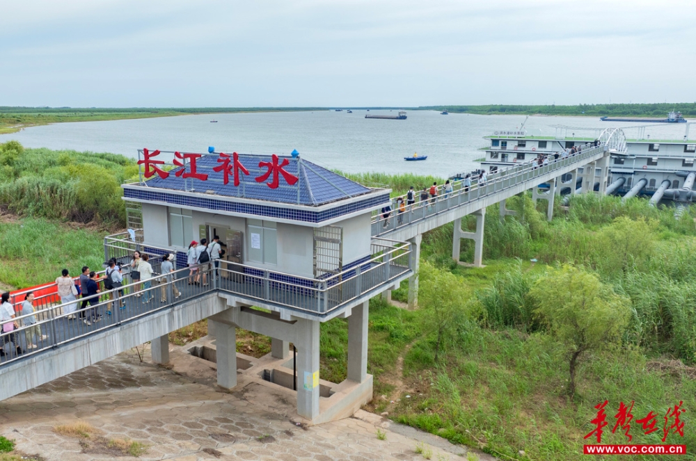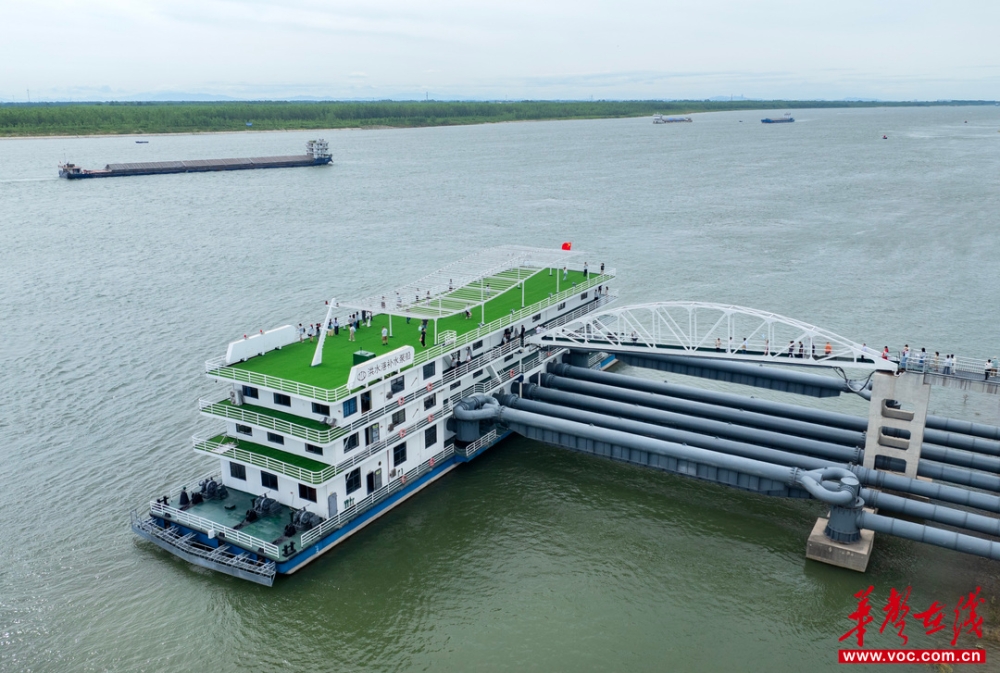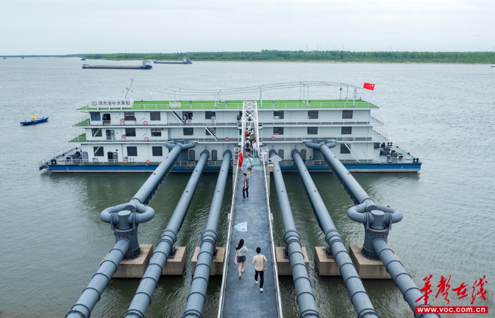 “泵船作业时,江水通过这7根长100多米、直径1.5米的大管道连续不断地排放至右侧的暗涵,再抽到河渠。”岳阳市水旱灾害防御事务中心长江补水及洋溪湖水利工程事务所所长朱毅介绍,泵船随水位上下浮动,能在低枯水位抽水,通过垸内支渠送至华洪运河、华容河。