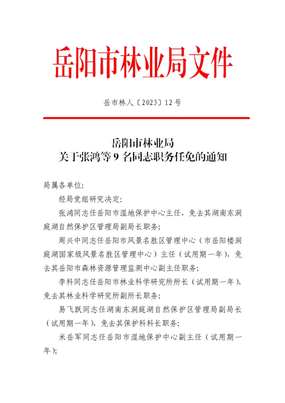 岳阳市林业局关于张鸿等九名同志的职务任免通知
