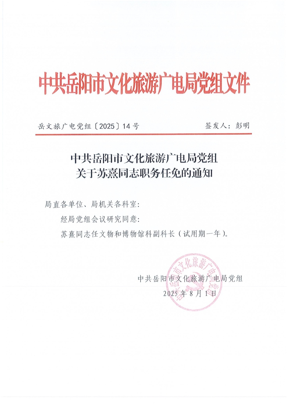 关于苏熹同志职务任免的通知(岳文旅广电党组〔2025〕14号)