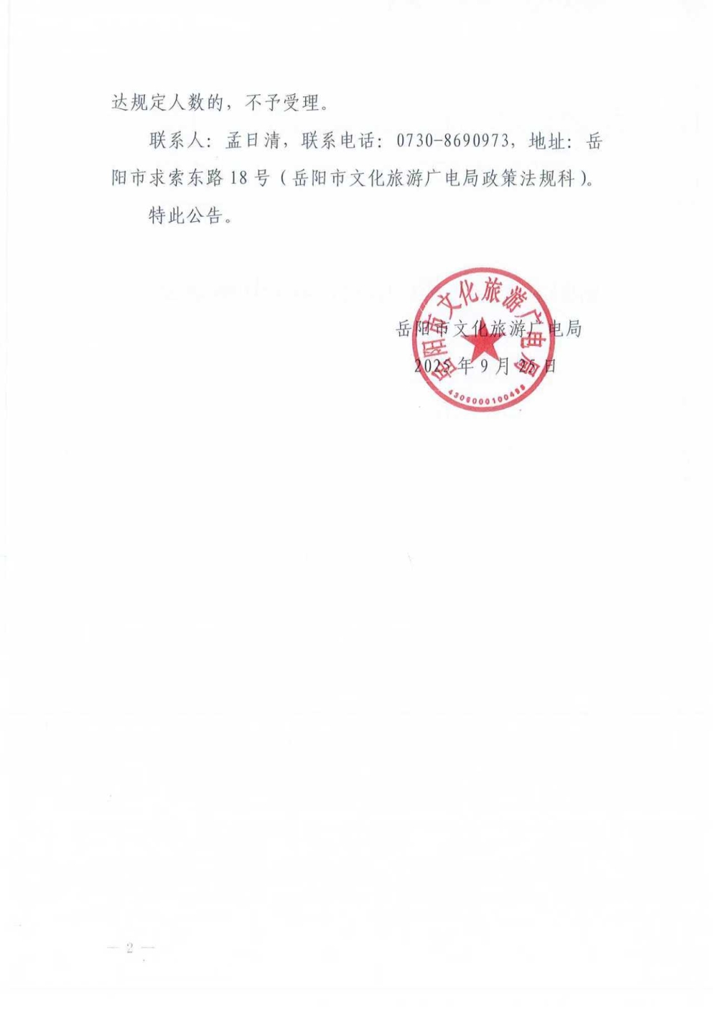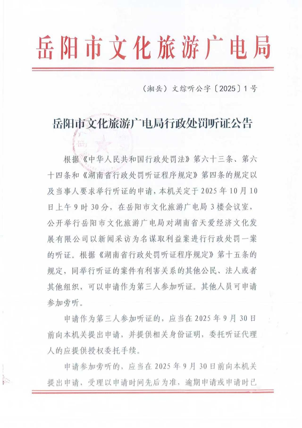 岳阳市文化旅游广电局行政处罚听证公告 (湘岳)文综听公字〔2025〕1号