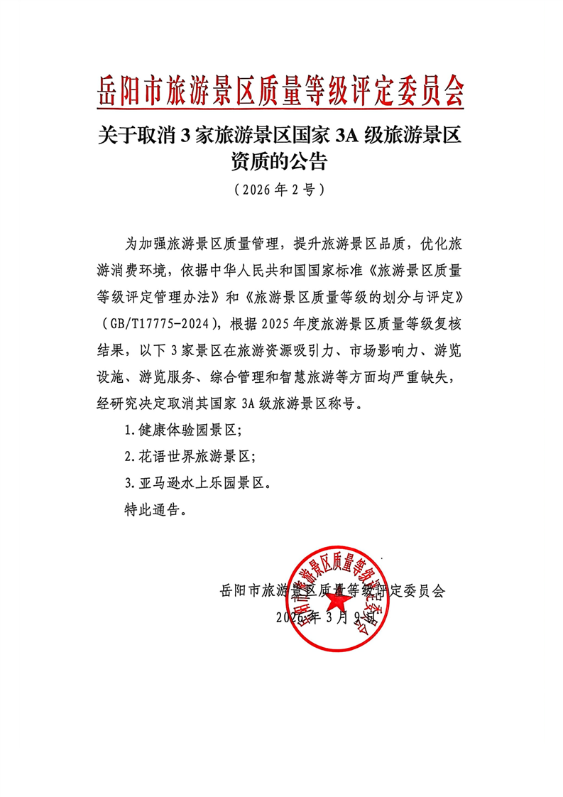 关于取消3家旅游景区国家3A级旅游景区资质的公告