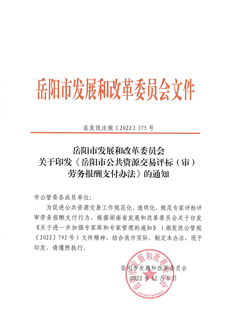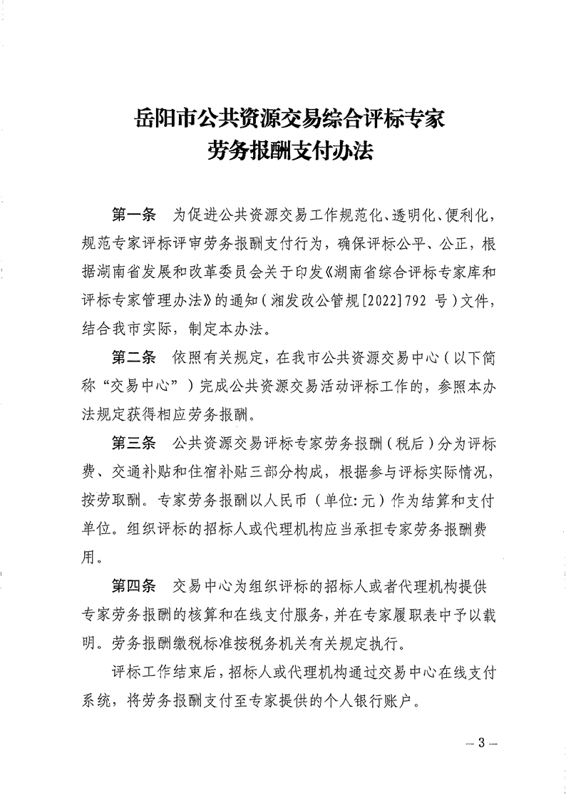 岳阳市发展和改革委员会关于印发《岳阳市公共资源交易评标(审)劳务报酬支付办法》的通知