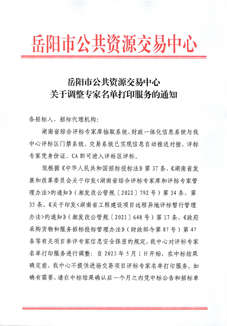 岳阳市公共资源交易中心关于调整专家名单打印服务的通知