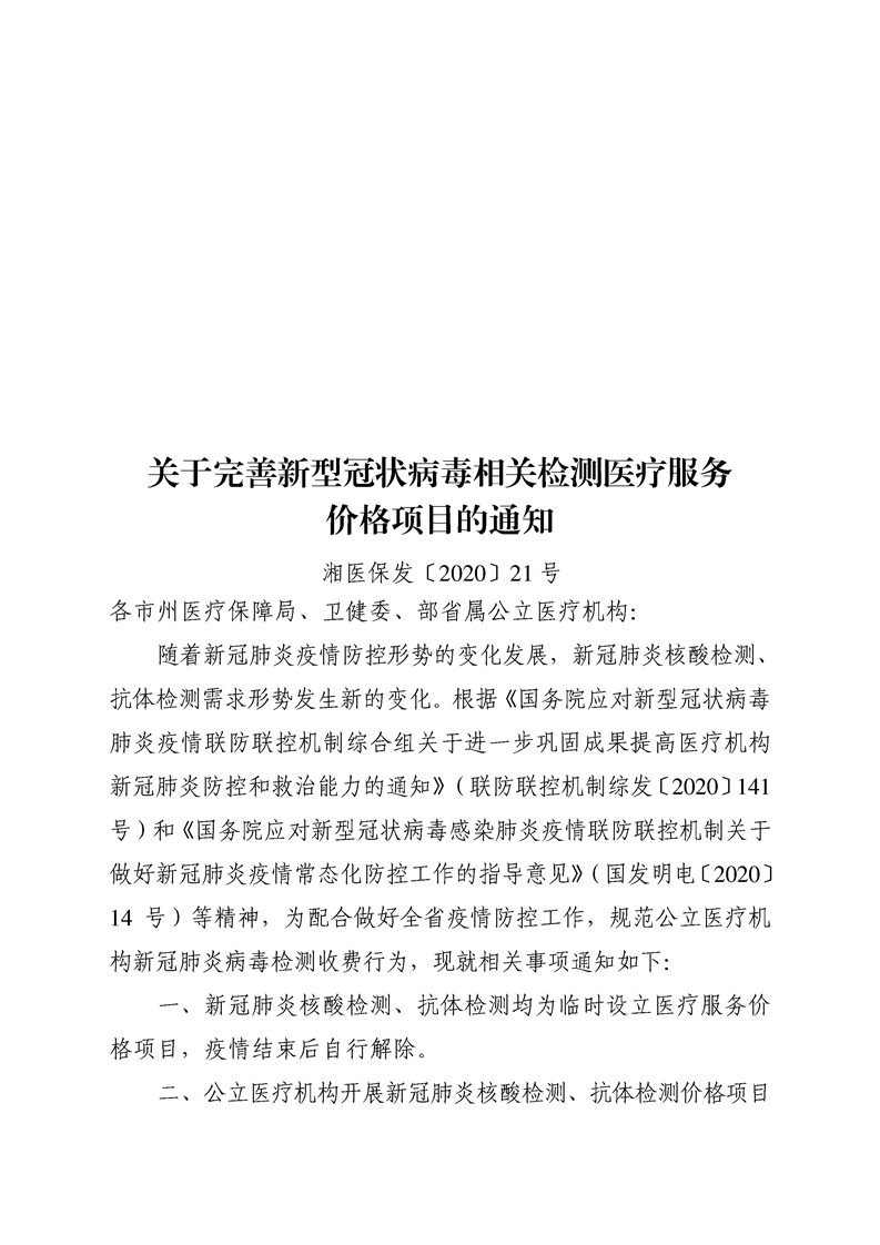 湖南省医疗保障局、湖南省卫生健康委员会关于完善新型冠状病毒相关检测医疗服务价格项目的通知