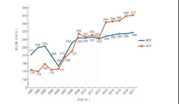 △1990—2017年中国城乡居民心血管病死亡率变化