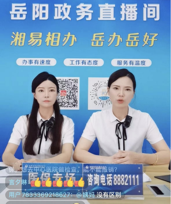 “医保政策进万家,医保服务暖人心,大家好,我们今天政务直播的主题是2024年医保政策和经办服务...”。6月28日,岳阳医保政务直播专场在市政务中心政务直播间开播,此次直播同步开通抖音、视频号等新媒体平台,通过借助政务服务直播平台开启线上互动直播可视化服务模式,实现广大市民与医保工作人员线上互动交流,让医保政务服务更贴心、更暖心。