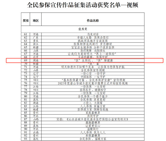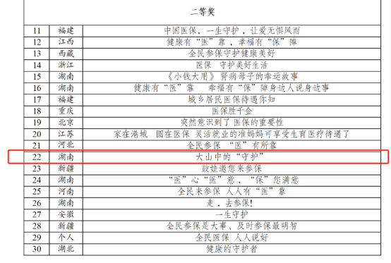 近日,国家医保局办公室公布了全国全民参保宣传作品征集活动获奖名单,我市2件参赛作品获奖。其中,岳阳市医保局参赛作品《大山中的“守护”》荣获二等奖;平江县医保局参赛作品《“医”生所托,“保”障健康》荣获优秀奖。