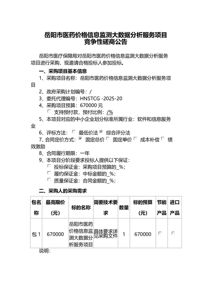 岳阳市医药价格信息监测大数据分析服务项目竞争性磋商公告