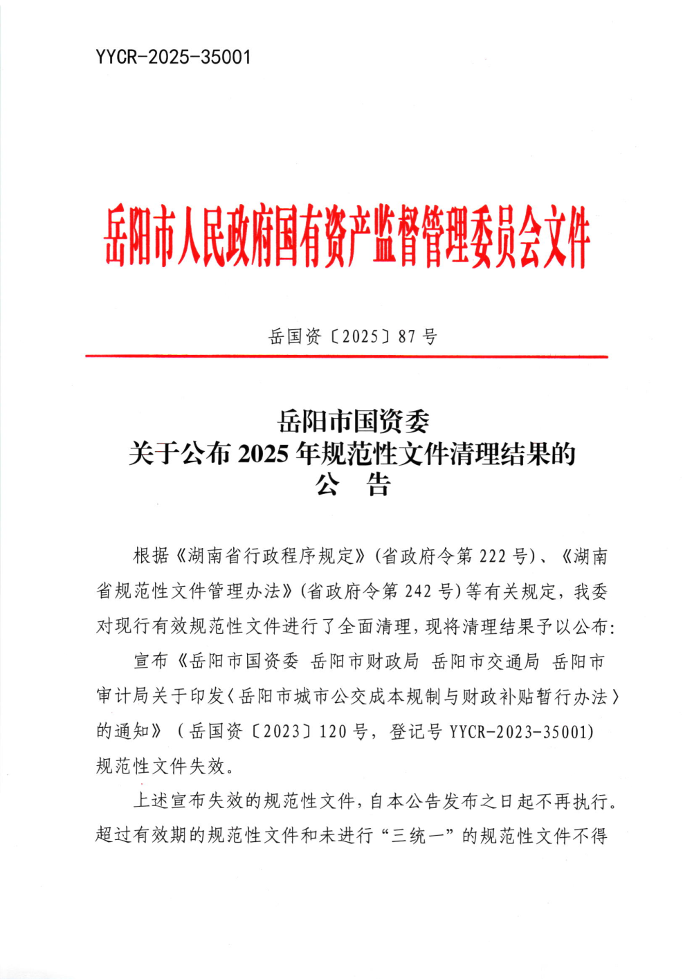 岳阳市国资委关于公布2025年规范性文件清理结果的公告