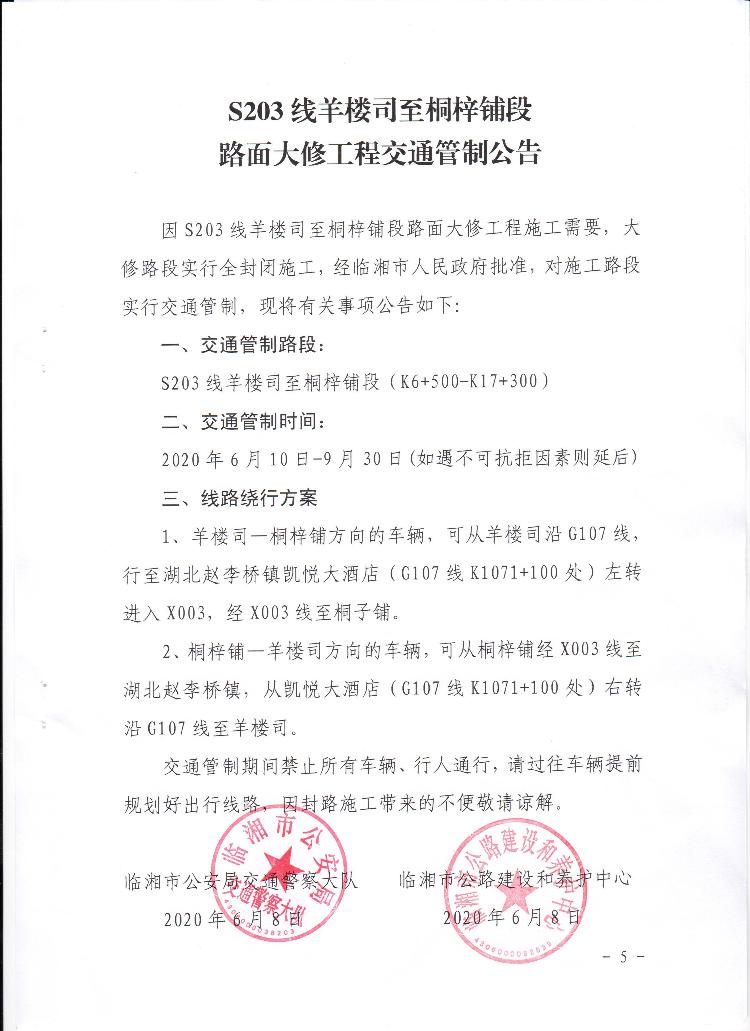 S203线羊楼司至桐梓铺段路面大修工程交通管制公告