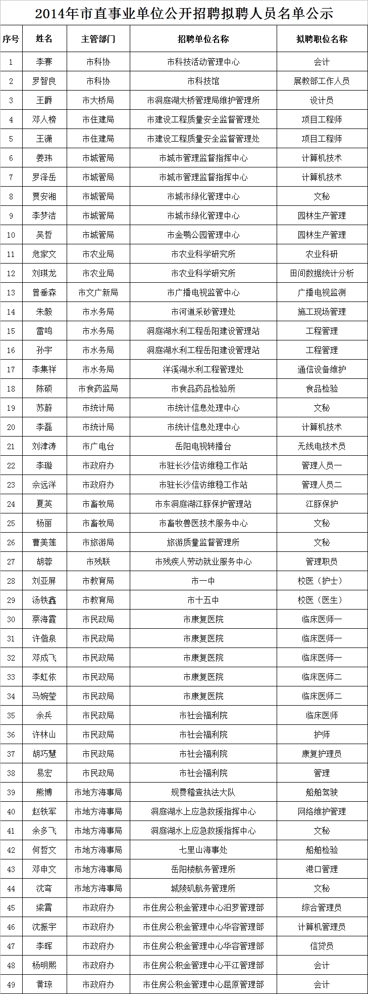 2014年市直事业单位公开招聘拟聘人员名单公示