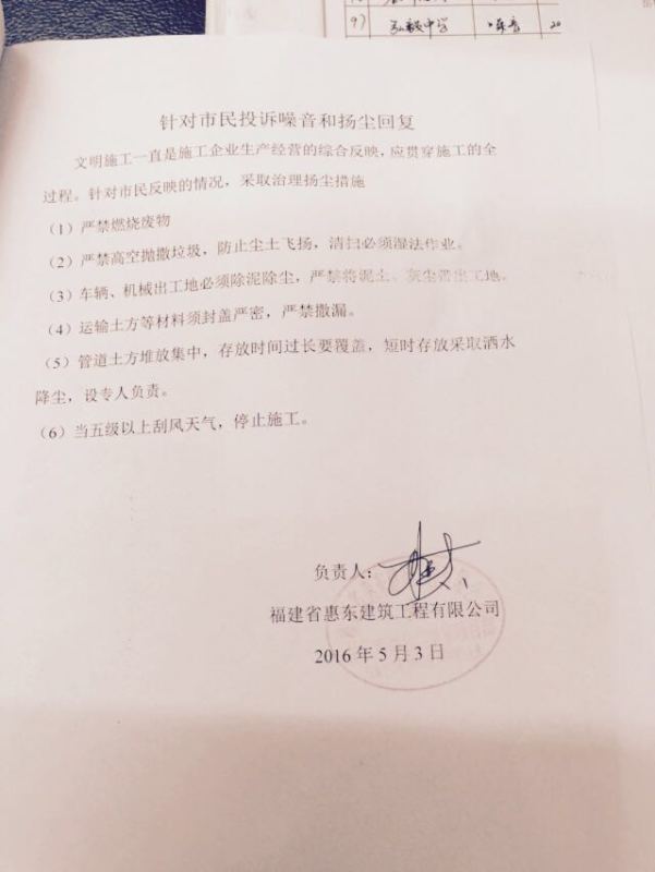 | 回复内容: | 伍勇同志: 您好!您的来信收悉,现回复如下: 我局将您来信中反映的问题,按照工作责任划分,分派至市建设工程质量安全监督处和市建设工程监察支队。上述两单位进行了调查处理,对于原井水小厨装修噪声问题,市建设工程监察支队到现场进行了处置,该店面装修负责人已承诺进行整改。对名门世家项目扬尘扰民问题,市建设工程质量安全监督处对施工单位进行了约谈,要求整改,施工单位已出具整改方案(详见附件)。欢迎您配合我局对上述有关单位进行后续监督,若有再次扰民现象,您可直接拨打07308222580,向我局办公室反映。我们也将督促有关单位认真落实到位。 特此回复。 岳阳市住房和城乡建设局 2016年5月5日 |