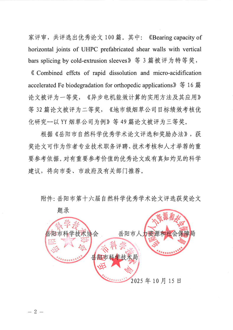 关于岳阳市第十六届自然科学优秀学术论文评选结果的通报