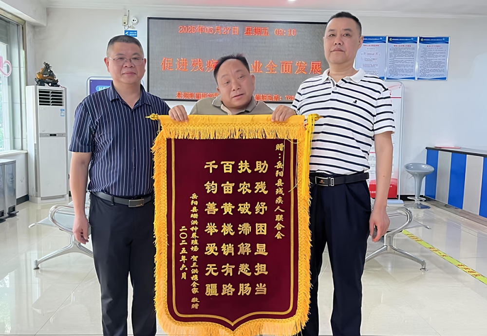 “助残抒困显担当,扶农破滞解愁肠。百亩黄桃销有路,千钧善举爱无疆。”——一面鲜红的锦旗被残障果农贺三洪紧紧攥在手中,锦旗上的烫金大字映着他湿润的眼眶,随锦旗一同送来的,还有一封情真意切的感谢信。在岳阳县残联办证大厅里,贺三洪正与残联党组书记、理事长刘其波分享着黄桃销售破滞的喜悦,工作人员递上的热茶氤氲着热气,正如这一场爱心接力传递的温度。