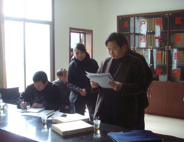 图为副调研员、就业中心主任巢向阳正在查看岳阳楼区残疾人就业工作档案资料。(左一为侯定旺理事长)