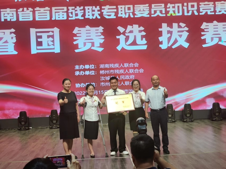 7月15日上午,湖南省首届残联专职委员知识竞赛暨国赛选拔赛在汝城县沙洲村举行。来自全省十四个市州代表队同场竞技,岳阳市代表队在比分落后的前提下,经过每人必答、每队必答、互问互答、抢答、风险答题5个环节一路过关斩将,最后以绝对优势脱颖而出,拔得头筹,喜获冠军。