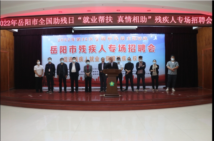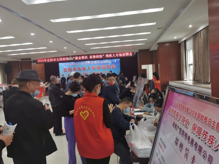 为进一步贯彻落实党中央、国务院关于进一步做好残疾人就业服务工作的决策部署,严格执行国务院办公厅印发的《促进残疾人就业三年行动方案(2022—2024年)》精神,为有就业需求的残疾人和用人单位搭建便捷、精准、实效的就业服务平台,帮助我市更多残疾人实现就业增收,5月19日,岳阳市残联举行了第32次全国助残日“促进残疾人就业,保障残疾人权益”残疾人专场招聘会”。作为协办单位,岳阳楼区残联、岳阳县残联、云溪区残联、君山区残联、经济技术开发区残联、南湖新区残联和岳阳市肢残人协会、岳阳市聋人协会精心组织230余名渴望就业的残疾人参加了招聘会。岳阳市残联党组书记刘利文,理事长李建军,党组成员、副理事长李正望、邹湖平,四级调研员陈更生等领导和招聘单位湖南源设动漫设计有限公司、湖南贝烨医疗器械有限公司、湖南康之健科技有限公司、岳阳市瑞声科技有限公司、岳阳市德馨助残服务中心“天使人专业技能培训基地”、湖南广恒照明电器有限公司、岳阳市爱达兴智能科技有限公司等七家用人单位的主要负责人、人事主管参加招聘会。