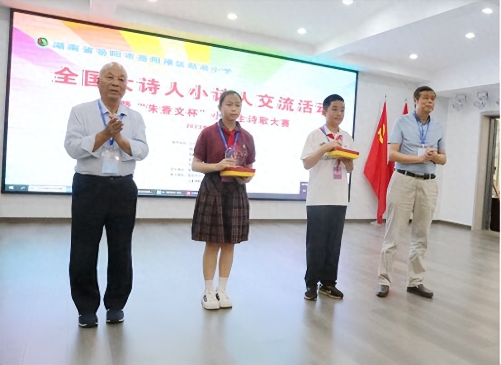 自今年4月15日全国小学生诗歌大赛启动以来,共收到来自全国各地4000多篇作品,经初审、复审、终审,共评出一等奖2名、二等奖3名、三等奖8名、优秀奖59名、优秀指导老师13名以及岳阳优秀诗教教师奖10名。岳阳楼区白杨坡小学羿朵蕊、山东省聊城市高唐县第一实验小学朱梓豪荣获一等奖。