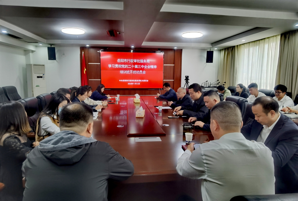 学习贯彻好党的二十届三中全会精神是当前和今后的一项重大政治任务,根据市委组织部工作提示要求,11月12日-15日岳阳市行政审批服务局机关党委在局机关810会议室组织开展学习贯彻党的二十届三中全会精神集中培训班。11月12日上午10点举行开班动员大会,由机关党委常务副书记黎杰主持,局党组副书记、副局长、机关党委书记谢芳茂出席并做动员讲话,对本次培训提出了要求。开班动员后分批次集中观看了“深入学习贯彻习近平总书记关于全面深化改革的一系列新思想、新观点、新论断和党的二十届三中全会精神”“发挥经济体制改革牵引作用,全面推进各领域改革”“加强党对进一步全面深化改革的领导”视频课程,并结合实际开展研讨和交流发言。