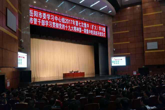 11月15日上午,市委学习中心组2017年第七次集中(扩大)学习暨市管干部学习贯彻党的十九大精神第一期集中轮训班开班仪式在岳阳文化艺术会展中心举行。十九大代表、省委宣讲团成员、市委书记、市人大常委会主任胡忠雄作专题辅导报告,市委副书记、市长刘和生主持,市委副书记李爱武传达了中央两个文件精神。市领导徐新楚、向伟雄、唐道明、王瑰曙、胡小闽、马娜、谈正红和市委中心组全体学员、党员代表等800余人参加学习。