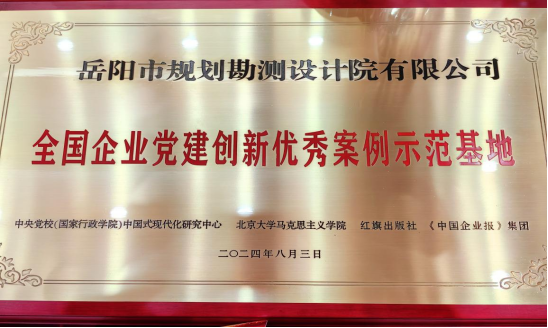 8月3日,2024全国企业党建(案例)研讨会暨第四届企业党建创新优秀案例发布仪式在北京成功举办。本次会议由中央党校(国家行政学院)中国式现代化研究中心、北京大学马克思主义学院、红旗出版社、《中国企业报》集团共同主办,中企党建研究院等单位承办。会上发布了2024年度(第四届)全国企业党建创新优秀案例名单,现场为“全国企业党建创新优秀案例示范基地”授牌,岳阳市规划勘测设计院有限公司(以下简称市院)荣获“全国企业党建创新优秀案例示范基地”称号,本次全国仅八家企业获此殊荣。