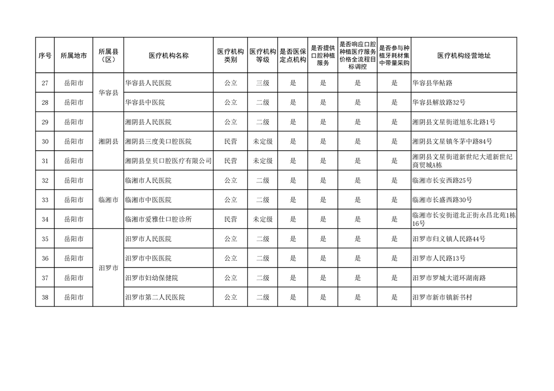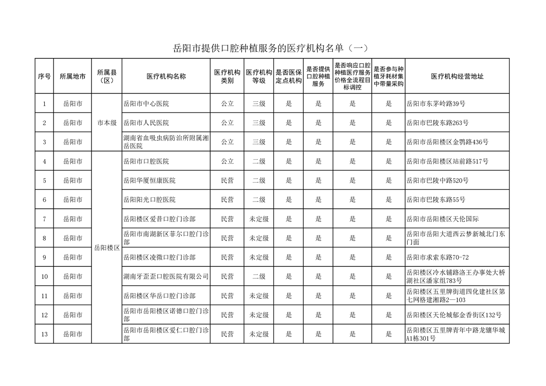 岳阳市提供口腔种植服务的医疗机构名单(一)