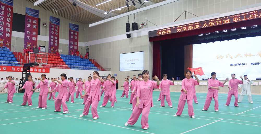 本次活动由华容县总工会主办,县太极拳协会承办,旨在庆祝中华全国总工会成立100周年,倡导和谐低碳生活方式,助力健康华容建设工程,弘扬积极健康、向上向善的太极文化,促进全民健身运动全面发展。活动现场,来自全县各乡镇、县直机关和企事业单位的职工方阵与社区群众自发组建的30支表演团队轮番登场。太极拳方阵率先亮相,参演者身着白衫,动作行云流水、刚柔并济,一招一式尽显太极神韵;太极拳表演者手持银剑,步伐轻盈,剑影与衣袂交相辉映,赢得观众阵阵掌声;柔力球团队将舞蹈艺术融入运动,随着音乐节奏,队员们灵活操控柔力球,小球上下翻飞,展现出蓬勃活力。