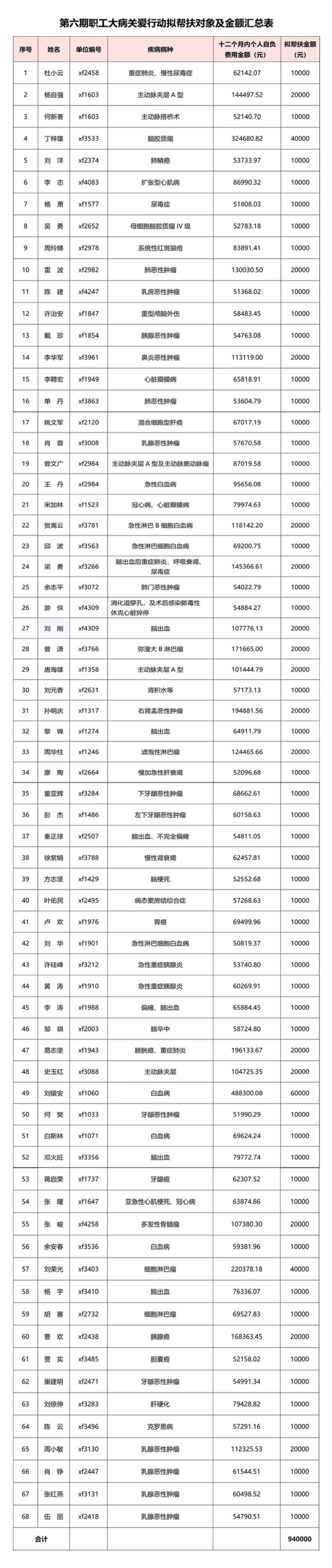 第六期职工大病关爱行动拟帮扶对象及金额公示