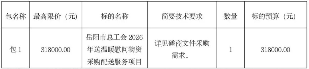 1、采购项目名称:岳阳市总工会2026年送温暖慰问物资采购配送服务项目