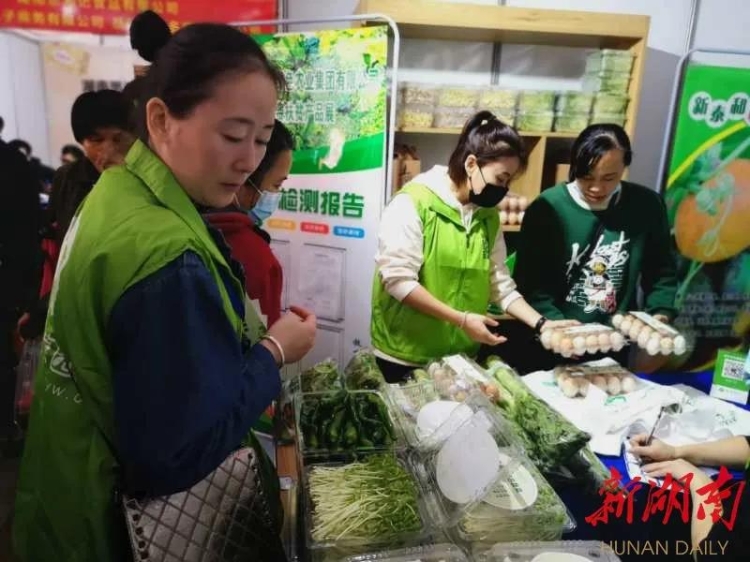 湖南新泰和绿色农产品有限公司的展位上摆满了黄瓜、辣椒、茄子等新鲜蔬菜以供选购,旁边还贴着当日的蔬菜质检报告。