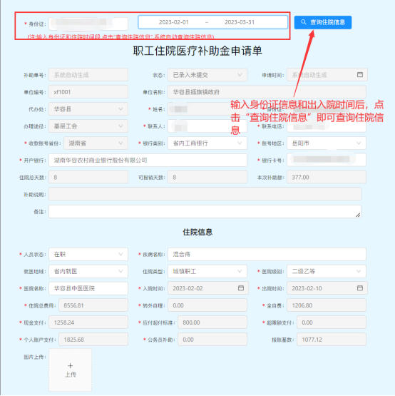 第三步:输入申请人身份证号和住院时间查询申请人住院信息,系统通过身份证号码及住院时间查询申请人住院记录并展示,申请人核对后选取要申请的时间段信息,开户银行、银行类别、银行卡号、上传的银行卡要保持一致,开户银行信息要按照市总统一要求的格式填报↓。