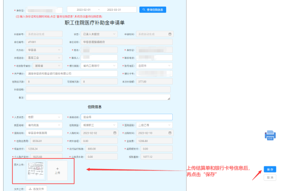 第四步:住院信息自动获取后,填写银行信息,并将结算单及银行账号信息通过图片或文件上传,上传后点击“保存”。申请单处于保存状态时,申请人还可以修改,提交流程后无法再修改。