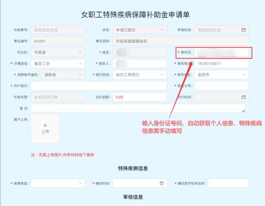 注:以上资料(abcde)请先拍照发图区总工会再转发市总线上先审核,确定补助金额后,再将以上所有资料交到区总工会医疗互助一楼103办,区总工会再交市总专家审核通过后发放补助金。输入银行信息,填写完成后点击“暂存”保存了填写的内容,确认无误后点击系统右下角“提交”提交到代办处审核。(特别注意:银行类别、开户银行、银行卡号必须保持一致)详见↓特殊疾病的资料不用上传,先将首次发病的资料发至区总工会,区总工会发市里核定金额后,再交市总专家面审财务审核通过后发放补助金!