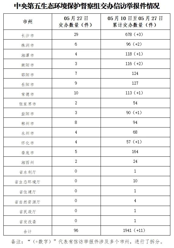 中央第五生态环境保护督察组今天向湖南交办群众信访举报件96件(来电举报69件,来信举报27件),其中重点件12件。我省分解后交办96件,其中重点件12件。