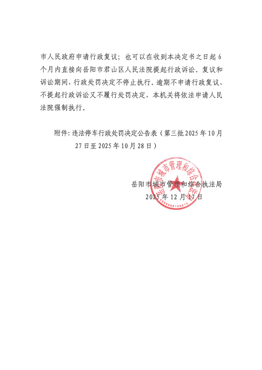 岳阳市城市管理和综合执法局违法停车行政处罚决定公告(岳城管违停罚告字[2025]第3号)
