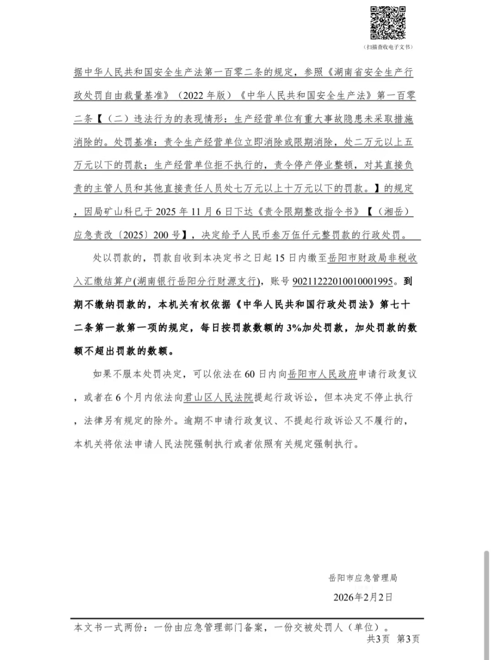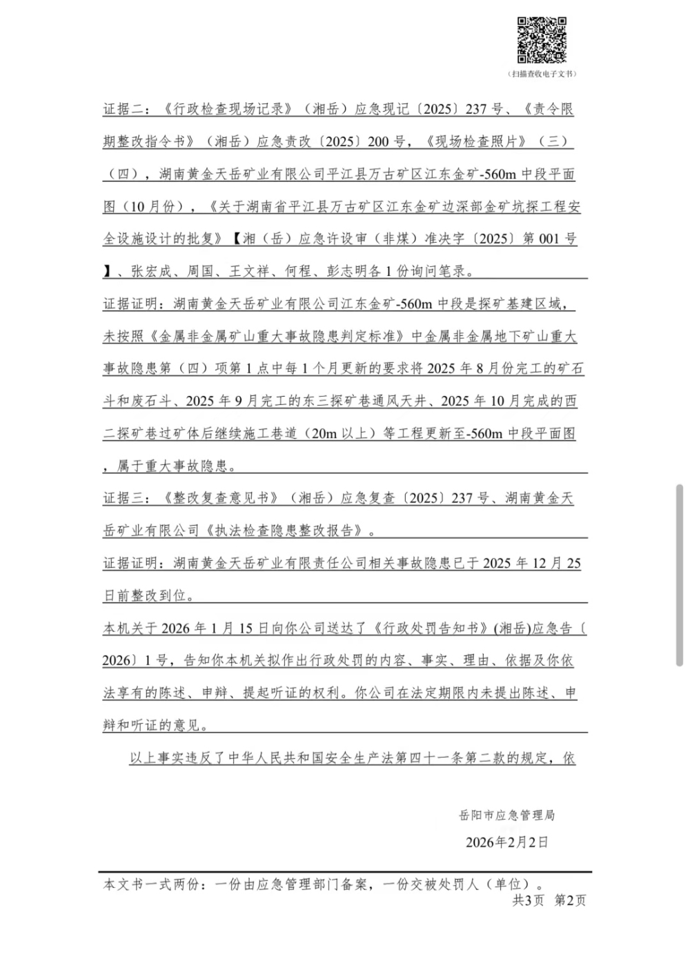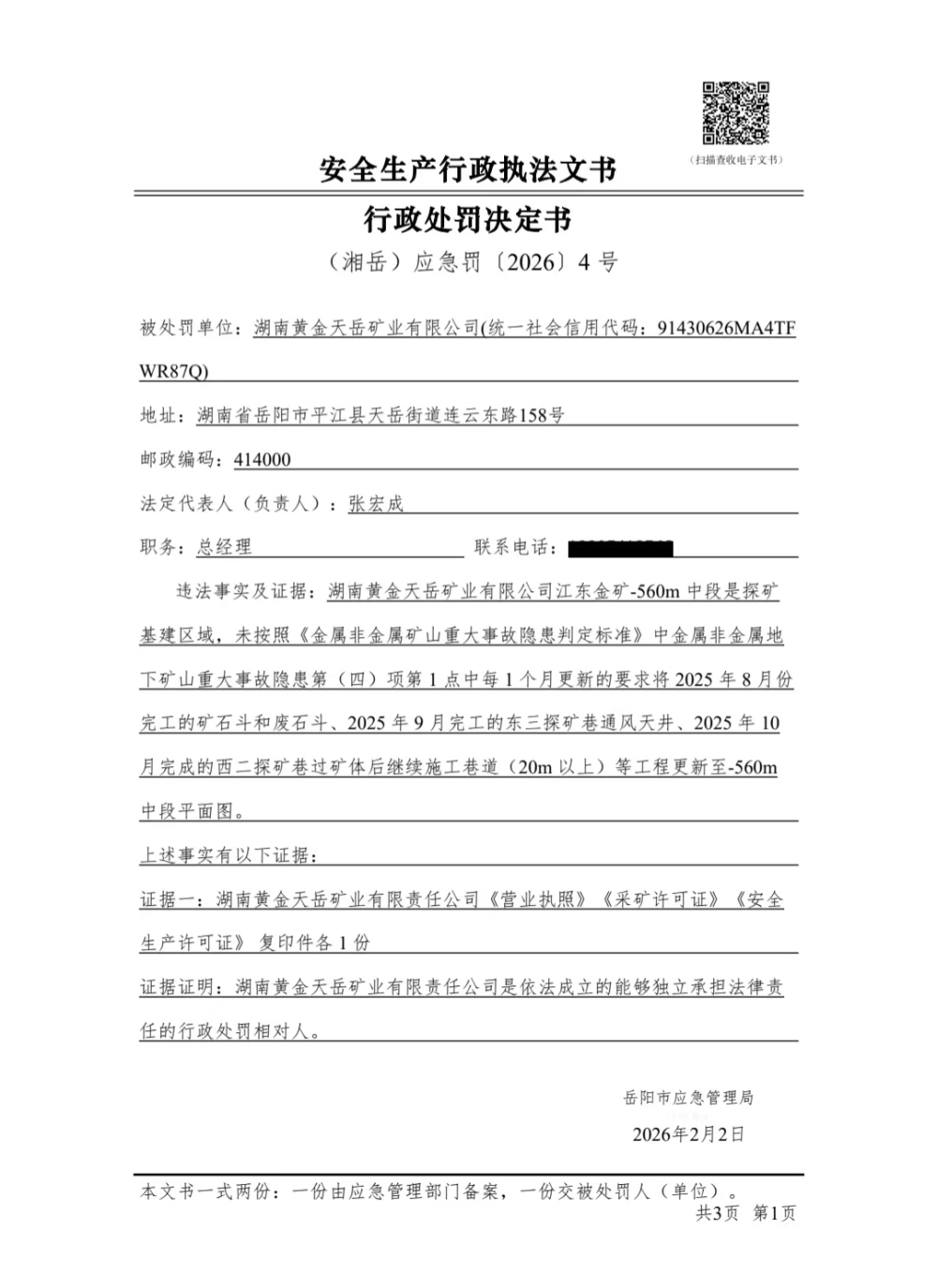 湖南黄金天岳矿业有限公司行政处罚决定书